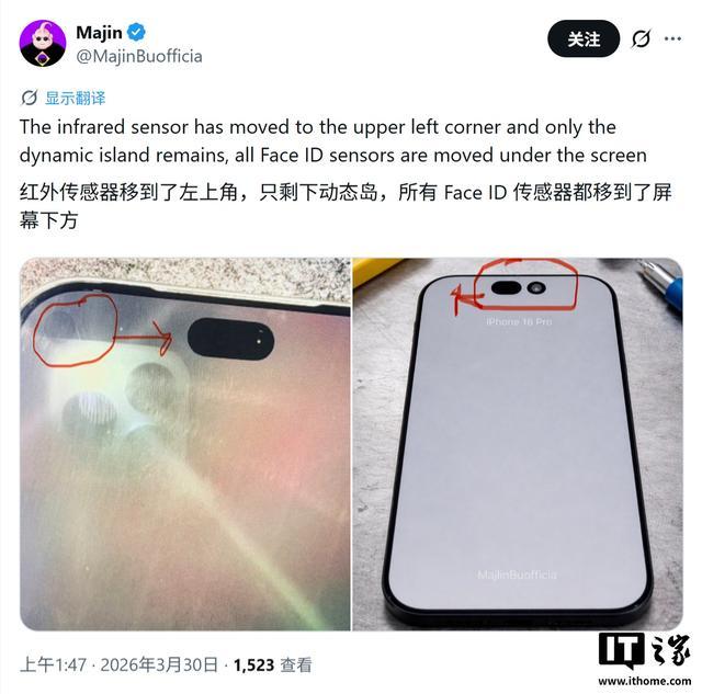 针对这张谍照,另一位爆料人 Majin Bu 给出详细技术分析。他指出,苹果将红外传感器巧妙移至屏幕左上角的显示屏下方。