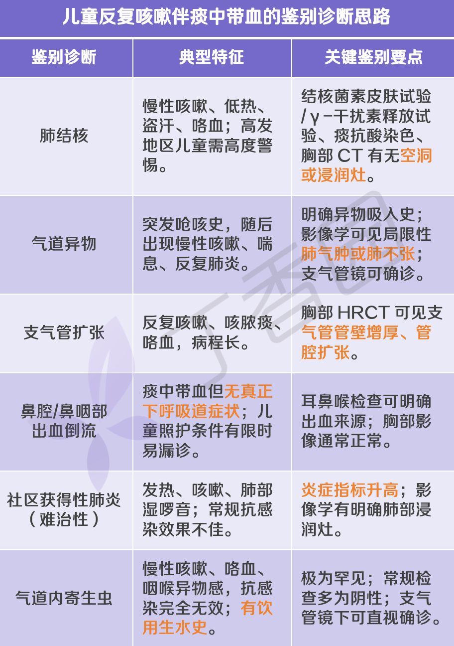 面对一个 8 岁患儿、反复咳嗽十余天伴痰中带血、外院抗感染治疗效果不佳的临床表现,常规的鉴别诊断思路并不少。